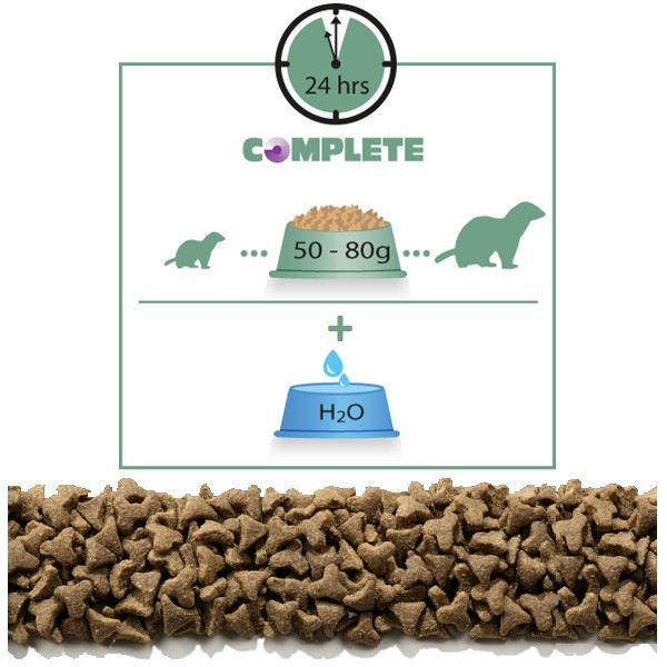 Питание без забот! Complete Ferret – полноценный сбалансированный корм для хорьков, полностью удовлетворяющий диетические потребности вашего любимца. Вкусные гранулы «все-в-одном» содержат натуральное мясо курицы, индейки, утки и лосося. В совокупности белки животного происхождения в этом корме составляют 90% от общего количества протеина, что является чрезвычайно важным для здоровья вашего домашнего хищника. Корм для хорьков Versele-Laga Complete приготовлен с учетом этой особенности и содержит 20% жира и 40% протеина на основе мяса птицы (курица, утка, индейка) и рыбы (лосось). связаны со здоровьем у хорьков. Каждая гранула содержит таурин для укрепления сердечно-сосудистой системы, пребиотики для поддержки иммунной системы и обогащена витаминно-минеральным комплексом.