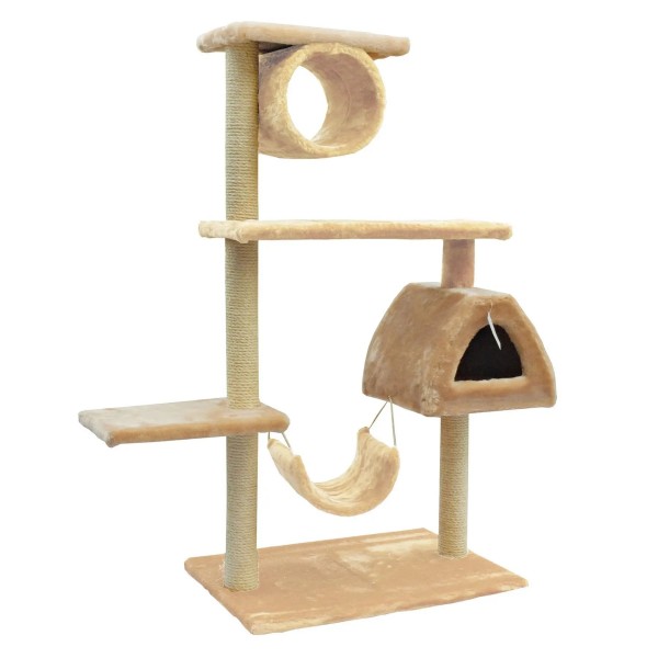 Перший ярус - затишний будиночок з одного боку і майданчик для ігор та відпочинку з іншого, між якими на міцних шнурах підвішено зручний гамачок зі штучного хутра. Другий ярус складається з просторого майданчика, а третій - з невеликого майданчика з прикріпленим до нього барабаном, оббитим штучним хутром. Тут мурлик зможе і пограти, і відпочити